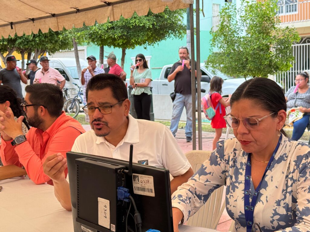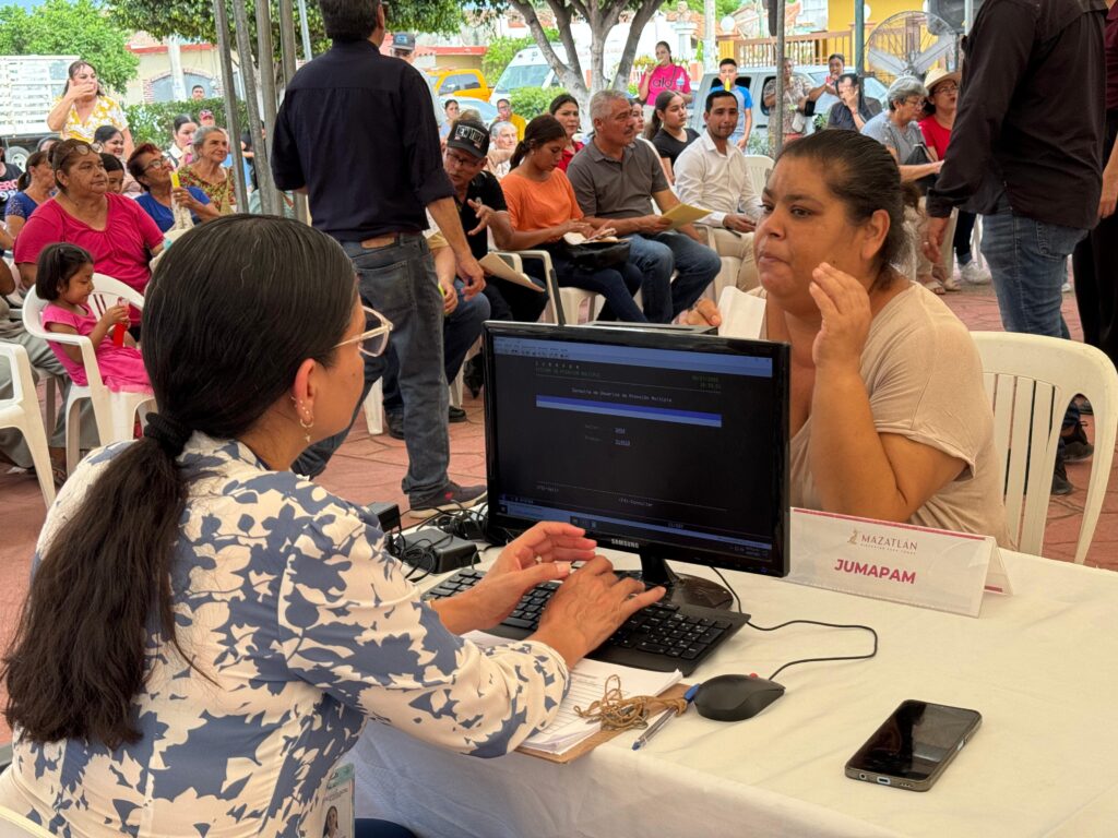 Escamillas, Mazatlán, Sinaloa.- Más de una decena de usuarios del servicio de agua potable, fueron atendidos por personal de la Gerencia Comercial y Cultura del Agua de JUMAPAM, en el marco del programa “Contigo Mazatlán”, que encabeza la Presidenta Estrella Palacios Domínguez, junto a su Equipo del Bienestar, que en esta ocasión se llevó a cabo en la Comisaría de Escamillas, al sur de Mazatlán.