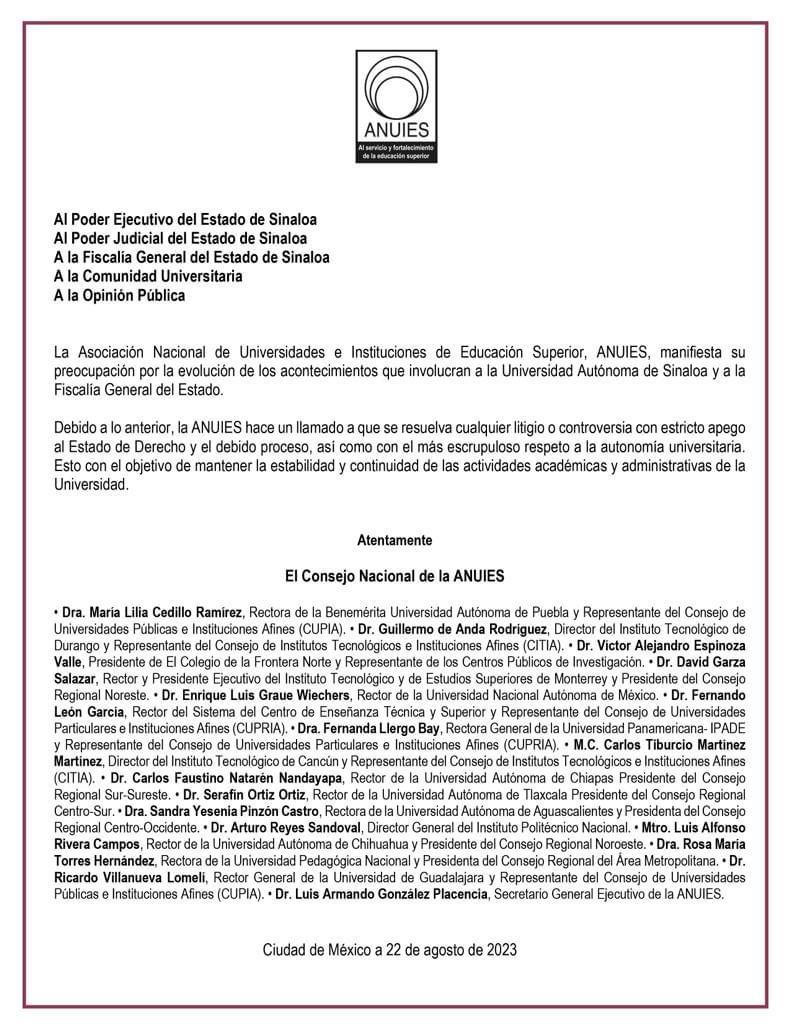 En el documento, dirigido tanto al Poder Ejecutivo como Judicial de Sinaloa, así como a la misma Fiscalía, la comunidad universitaria y la opinión pública, la ANUIES hizo un llamado a que se resuelva cualquier litigio o controversia con estricto apego al Estado de Derecho y el debido proceso.