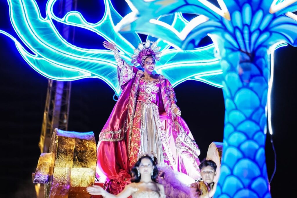 La luz en la profundidad fue el carro diseñado por Jorge Osuna, desde el cual saludó a los espectadores, SGM Ximena II, Reina Infantil de la Poesía 2025, acompañada por la Banda del Recodo y la comparsa Entre Luz y Sombra.