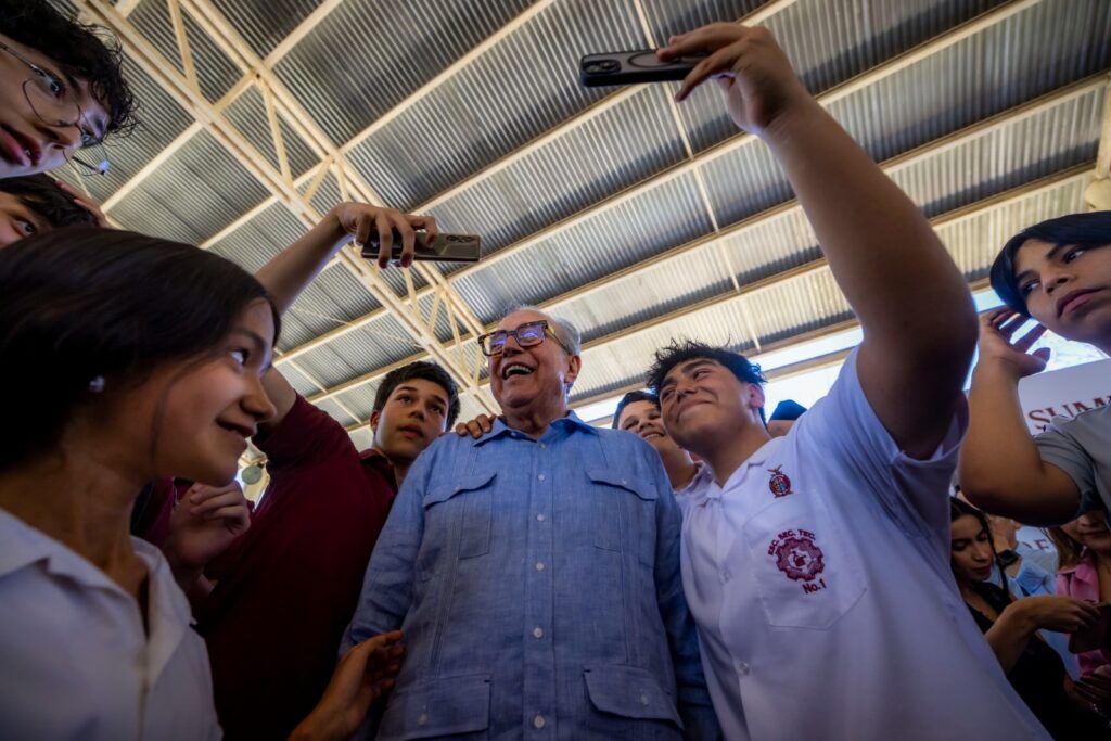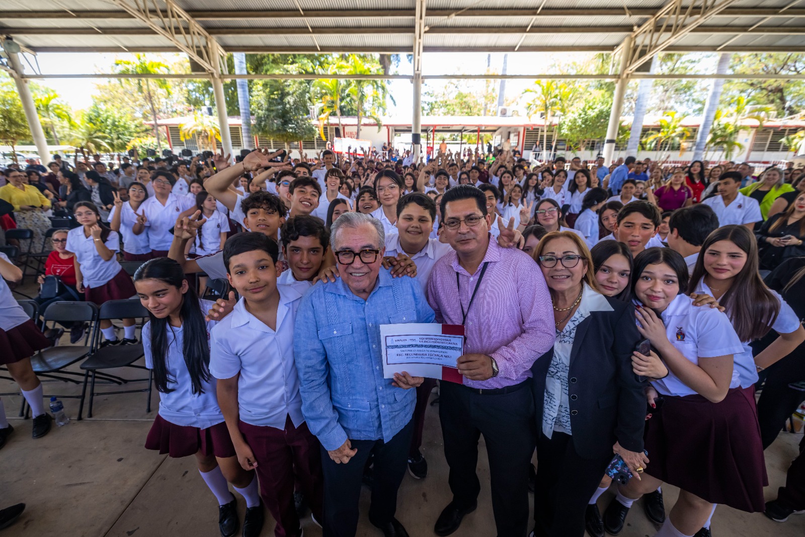 Acompañado por la secretaria de Educación Pública y Cultura, Gloria Himelda Félix Niebla, y por los dirigentes del SNTE, Genaro Torrecillas, de la Sección 27; y Ricardo Madrid, de la Sección 53, el gobernador Rocha visitó la Escuela Secundaria Técnica No. 1, emblemático plantel con más de cinco décadas de historia, desde donde hizo la entrega de mobiliario escolar y diverso material para el mantenimiento físico de las aulas.