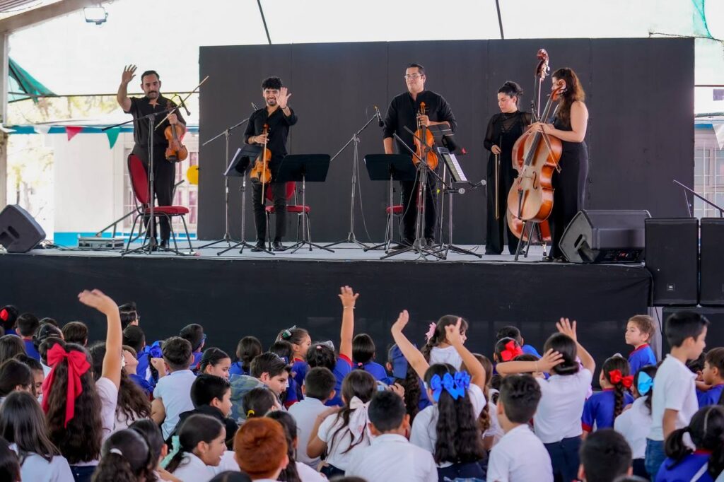 Mazatlán, Sinaloa.- En el marco de una mañana luminosa y cálida, la “Escuela Primaria 30 de Abril Día del Niño” se llenó de sonidos que evocaban mundos mágicos, emociones profundas y memorias compartidas. Un quinteto de cuerdas, conformado por músicos del Centro Municipal de las Artes, comprometidos con la difusión cultural, ofreció a niñas y niños un concierto inolvidable.