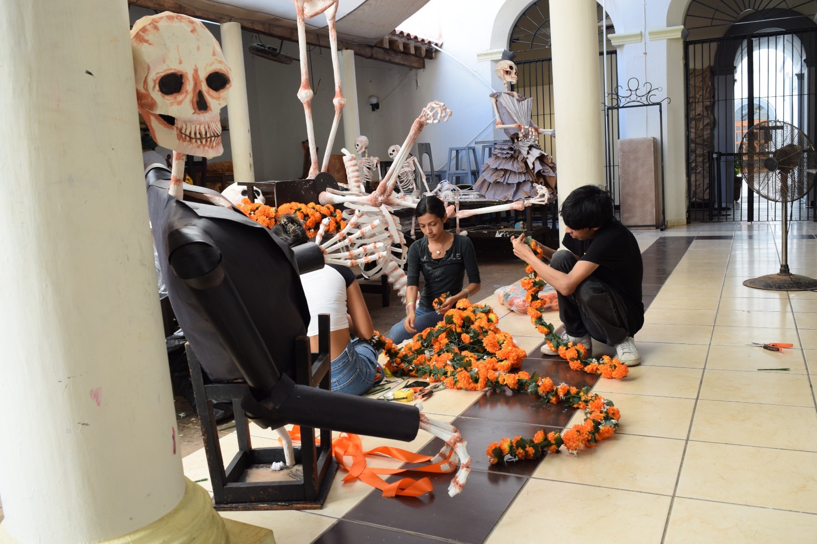A buen ritmo trabajan los artistas encargados de la decoración del Teatro Ángela Peralta y el Centro Municipal de las Artes para los recorridos con motivo del Día de Muertos.
