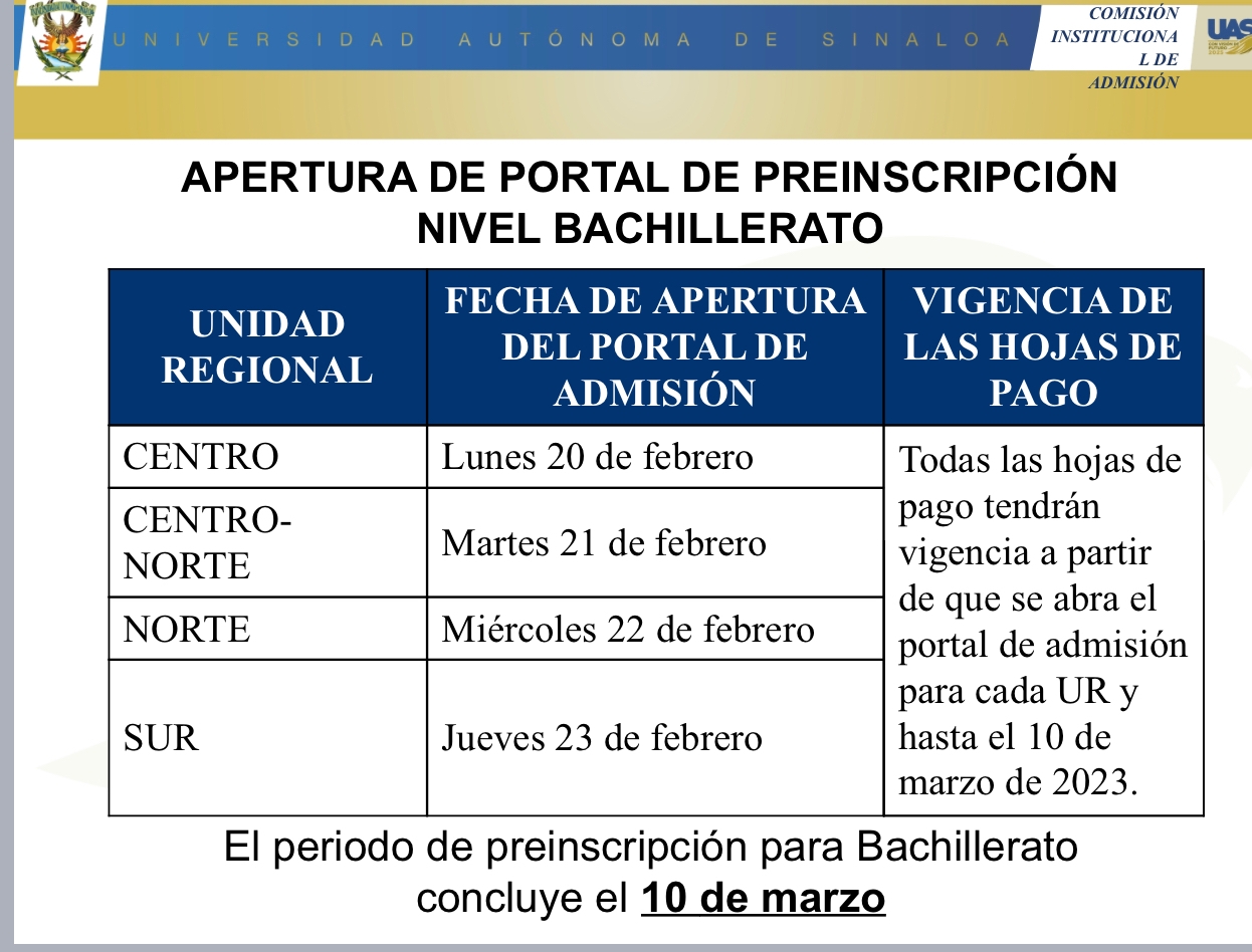 El lunes 20 de febrero se abre el portal para Bachillerato, iniciando con la entrega de fichas para la Unidad Regional Centro (URC) integrada por los municipios de Badiraguato, Navolato, Culiacán, Elota y Cosalá; el martes 21 de febrero para la Unidad Regional Centro Norte (URCN) con los municipios de Sinaloa, Guasave, Mocorito, Salvador Alvarado y Angostura; el 22 de febrero para la Unidad Regional Norte (URN) con Choix, El Fuerte y Ahome y el día 23 de febrero para la Unidad Regional Sur (URS) en Mazatlán, Escuinapa, El Rosario, Concordia y San Ignacio. Para este nivel el periodo de preinscripción concluye el 10 de marzo, fecha para la cual ya deberán tener pagados los recibos.