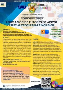 La Universidad Autónoma de Sinaloa (UAS), a través del Programa de Atención a la Diversidad (ADIUAS) de Secretaría Académica Universitaria (SAU), invita a docentes, tutores y personal encargado de la formación estudiantil, al Diplomado Formación de Tutores de Apoyo Especializados para la Inclusión con el objetivo de preparar al personal para enfrentar el reto de atender a la población estudiantil con necesidades específicas de apoyo educativo.