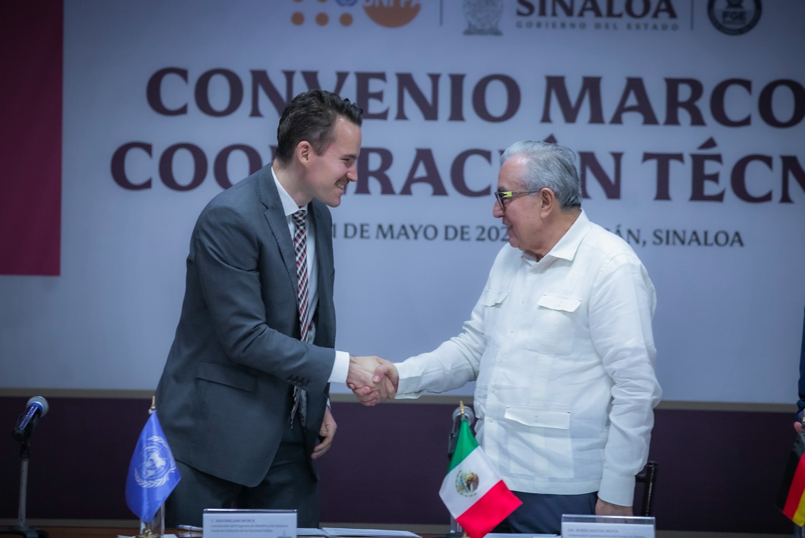 Culiacán, Sinaloa, a 21 de mayo de 2024.- El gobernador Rubén Rocha Moya signó un convenio marco de cooperación técnica con el coordinador del Programa de Identificación Humana del Fondo de Población de las Naciones Unidas, Maximilian Murck, mediante el cual este organismo internacional perteneciente a la ONU brindará ayuda al Gobierno del Estado y a la Fiscalía General del Estado para la identificación de restos humanos que se llevará a cabo en los Centros de Resguardo Temporal e Identificación Humana (CERTIDH), conocidos como panteones forenses, para que en este mismo año inicien las exhumaciones.