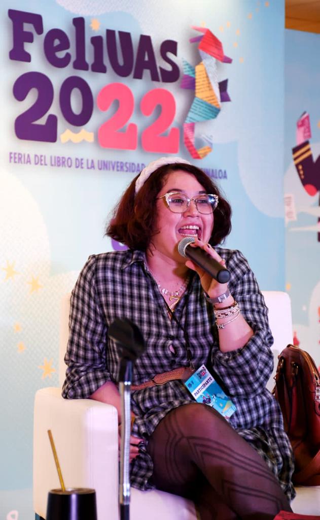 En el evento que se llevó a cabo en el foro principal de la feria, ubicado en el polideportivo de la UAS, la escritora agradeció a la universidad por la invitación; mostrándose muy contenta y feliz de ver a la gente, volver a las ferias y los viajes.