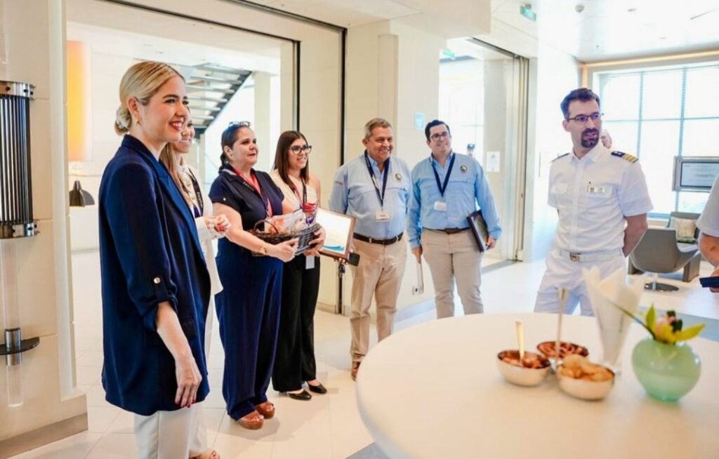 La Presidenta Municipal, Estrella Palacios Domínguez, la Secretaria de Turismo (SECTUR) de Sinaloa, Mireya Sosa Osuna, y el titular de la Administración del Sistema Portuario Nacional (ASIPONA) en Mazatlán, Contralmirante Mariel Aquileo Ancona Infanzón, dieron la bienvenida a los cruceristas y recorrieron el recinto fiscal.