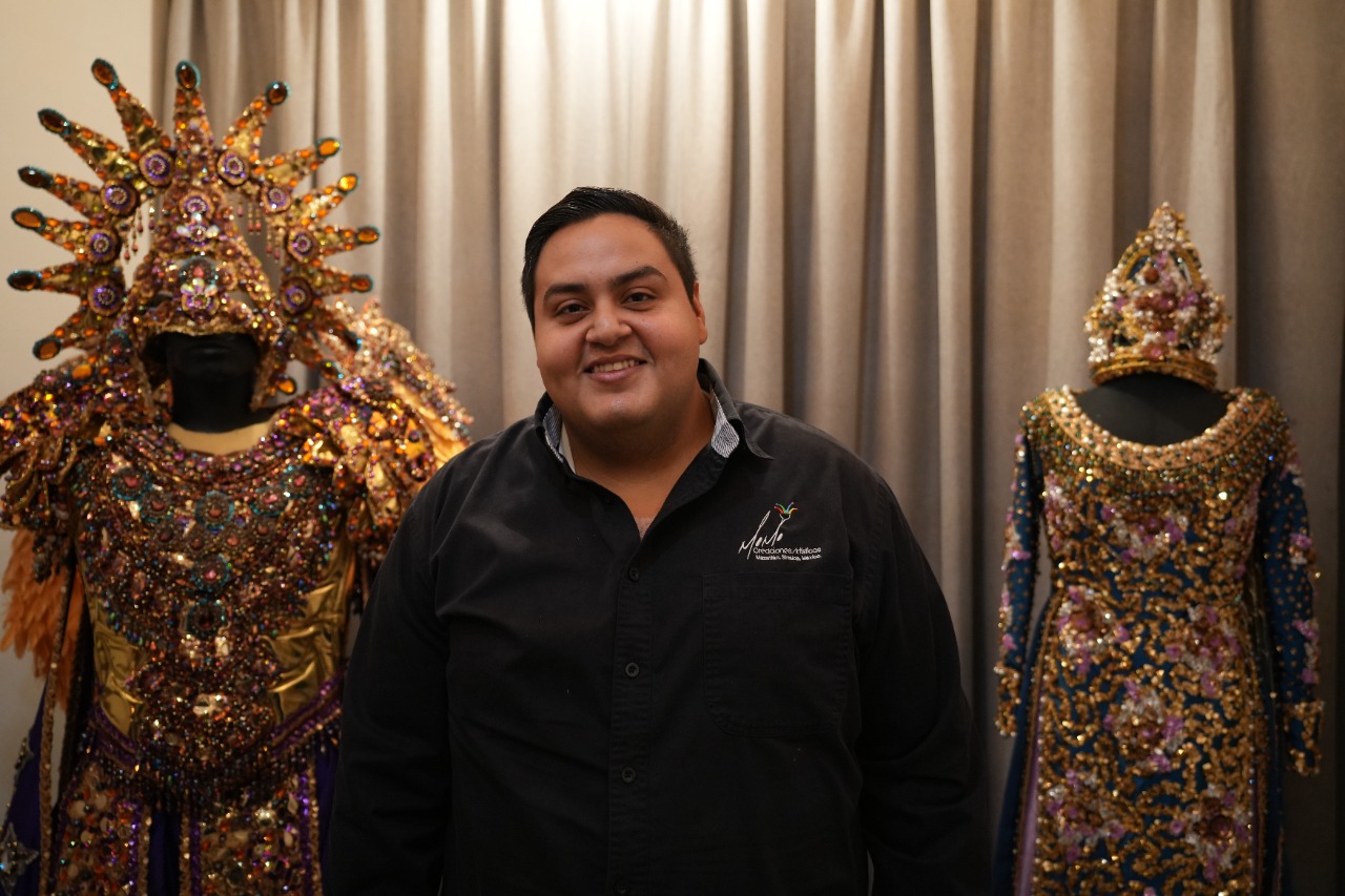Atento, sonriente y muy emocionado Luis Antonio Ríos González, diseñador y responsable de la confección del traje que portará el Rey del Carnaval de Mazatlán 2023, aguarda la primera pregunta.
