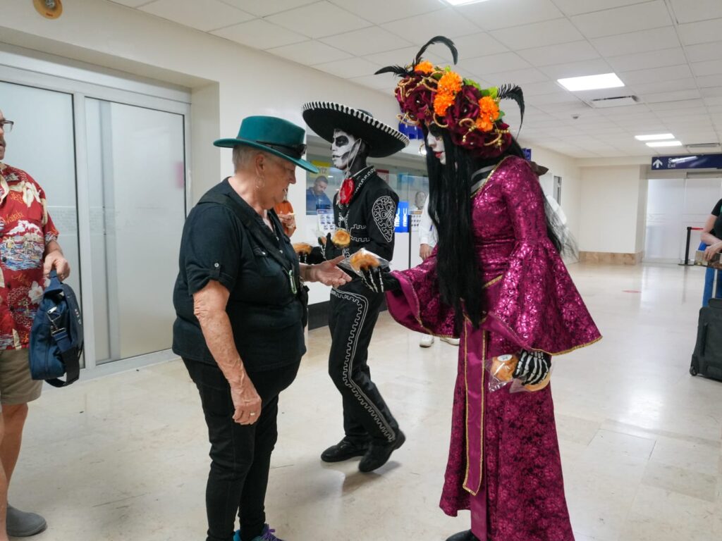 Al bajar del avión los pasajeros disfrutaron de una activación con temática de Día de Muertos, donde una elegante Catrina acompañada de su Catrín les obsequiaron pan de muerto. Y antes de salir de la terminal aérea, presenciaron otra activación con temática de piratas.