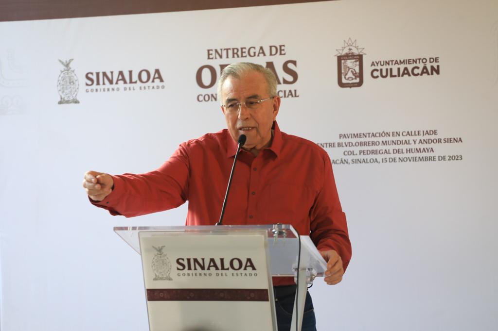 «En este año que estamos cerrando, llevamos más de 350 calles solo en la ciudad de Culiacán y también estamos pavimentando en las sindicaturas, porque ahí en las sindicaturas vive gente igual que ustedes, quieren también que no se les enloden los zapatos cuando van a entrar a su casa», señaló el Gobernador.