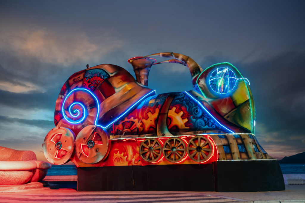 Una fusión de las máquinas de vapor y las criaturas míticas, este gigantesco caracol luminoso, tiene en la parte delantera la cabeza de un grillo, y su espiral representa el movimiento de la vida y el tiempo, los cuales no son lineales, sino un clico de vida. El poder, movimiento, fuerza, progreso y esperanza se conjuntan en esta creación. Visítalo a un costado de los famosos ‘Monos Bichis’.