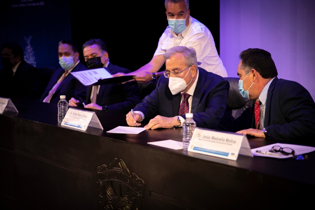 •Por su parte, el rector Jesús Madueña Molina, le agradeció al gobernador Rocha la firma de este convenio de colaboración que formaliza la relación de trabajo y fraternidad que se ha venido construyendo en los últimos meses entre la máxima casa de estudios y el Gobierno del Estado.