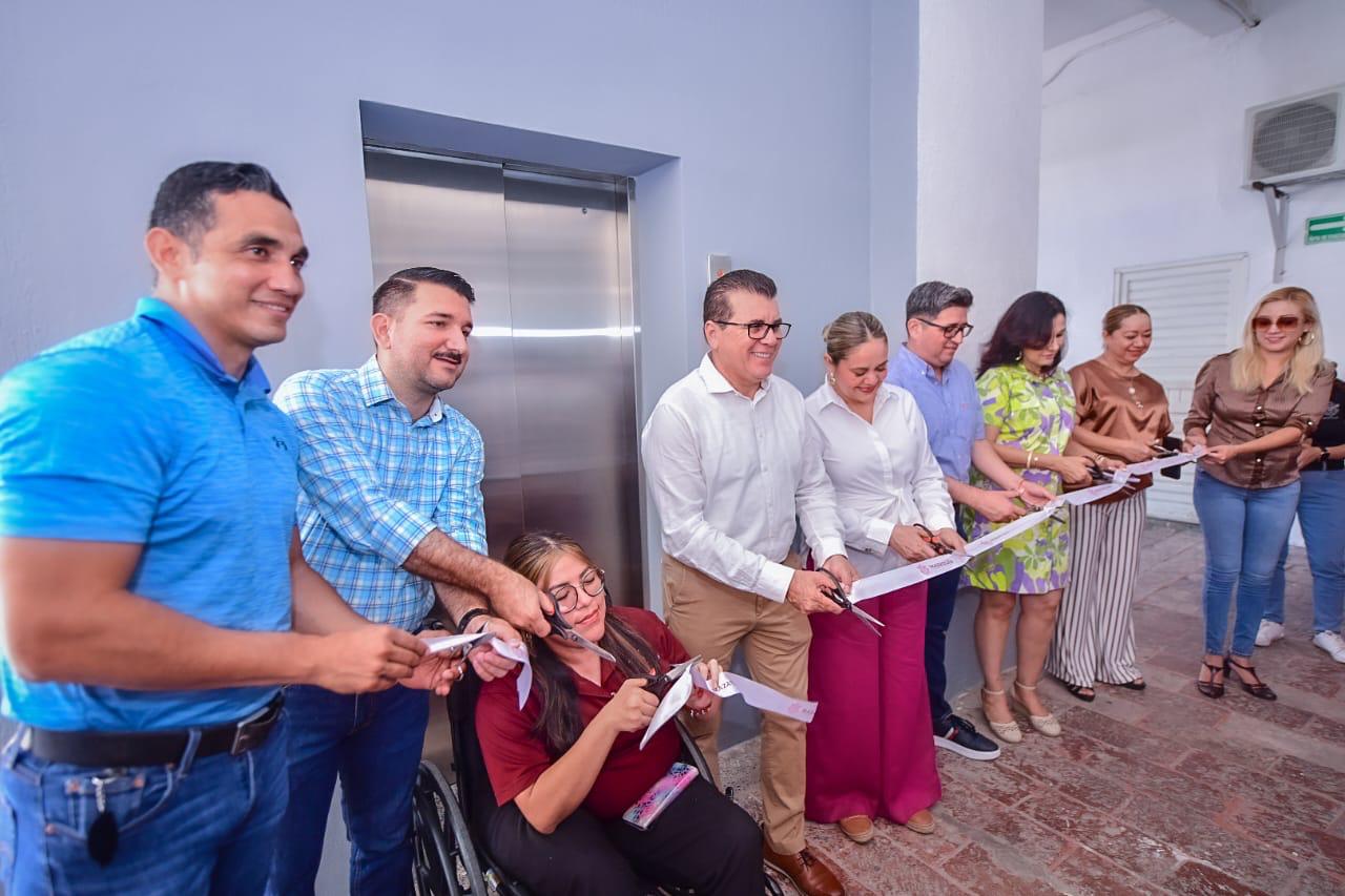 Mazatlán, Sinaloa.- Un elevador completamente nuevo fue inaugurado este miércoles en el Palacio Municipal. El Alcalde Edgar González y la Presidenta del Sistema DIF, María Teresa Apodaca de González, cortaron el listón inaugural acompañados de funcionarios municipales, regidores y personas con discapacidad.