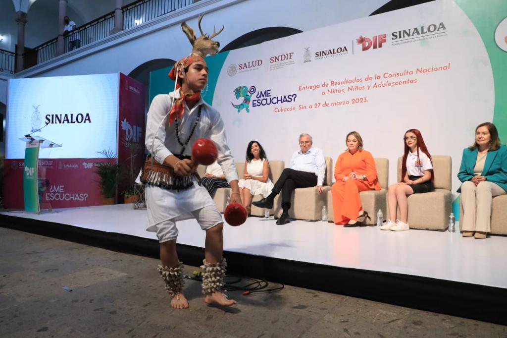 Culiacán, Sinaloa, a 27 de marzo de 2023.- Con el objetivo de fortalecer el ejercicio del derecho a la participación y escuchar las opiniones de niñas, niños y adolescentes sobre los temas que les interesan, este lunes, el Gobernador Rubén Rocha Moya acudió al acto de entrega de resultados de la Consulta Nacional ¿Me escuchas? 2022, impulsada por el Sistema Nacional para el Desarrollo Integral de la Familia (SNDIF) y la Comisión de Derechos Humanos de la Ciudad de México (CDHCMX), a través de la cual se recogieron a nivel nacional las necesidades, propuestas, intereses y preocupaciones para fortalecer la implementación de acciones que les beneficien de manera directa.