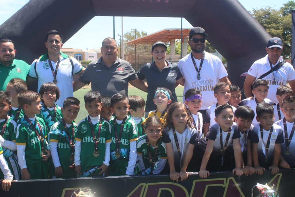 En representación de la Presidenta Municipal, Estrella Palacios Domínguez, la directora del Instituto Municipal del Deporte Mazatlán, Fabiola Verde, encabezó la ceremonia de premiación donde se reconoció la actuación del cuerpo arbitral, campeón goleador, subcampeón y campeón, ante el arropo de los padres de familia en las gradas.