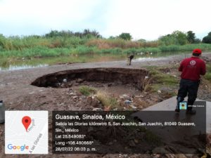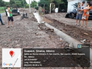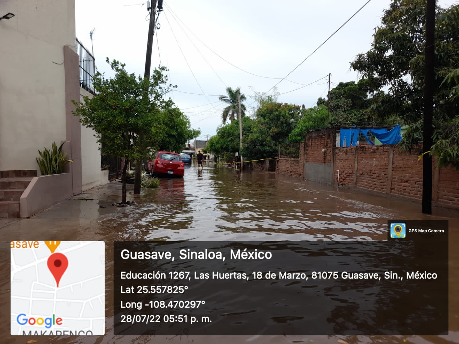 *Culiacán, Sinaloa, a 28 de julio de 2022.-* Derivado de la lluvia atípica registrada el día de hoy en el municipio de Guasave, cuya intensidad fue de 105 mm de precipitación, personal del Instituto Estatal de Protección Civil de Sinaloa que dirige Héctor Modesto Félix Carrillo, realizó recorridos de evaluación, en coordinación con personal de Protección Civil Municipal de Guasave, detectando las siguientes afectaciones: