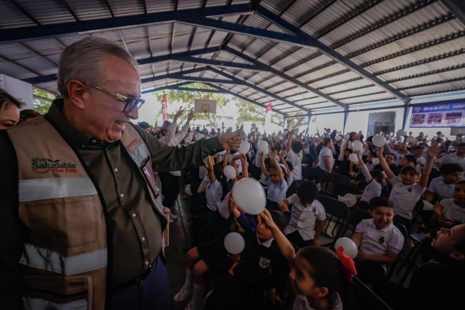 Culiacán, Sinaloa. – Ante la comunidad escolar de la primaria Eustaquio Buelna, una de las escuelas más antiguas y emblemáticas de Culiacán, el gobernador Rubén Rocha Moya puso en marcha en Sinaloa la Estrategia Nacional “Vive Saludable, Vive Feliz”, que se llevará a los más de 258 mil niñas y niños que cursan su educación primaria en todas sus modalidades.
