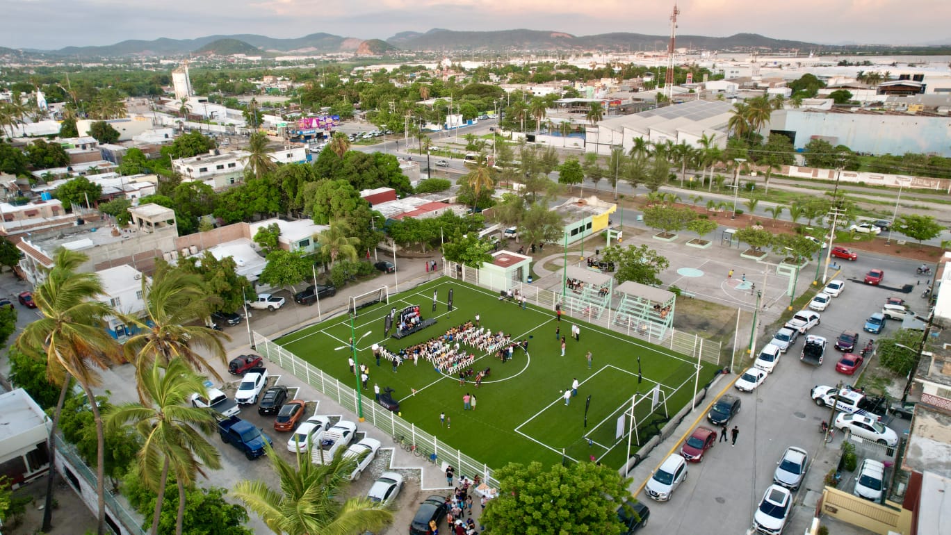 Con una inversión de más de 450 mil pesos, el Gobierno Municipal de Mazatlán, a través del Imdem, entrega la rehabilitación de la cancha de pasto sintético y cancha de usos múltiples ubicadas entre las colonias Casas Económicas y 12 de Mayo