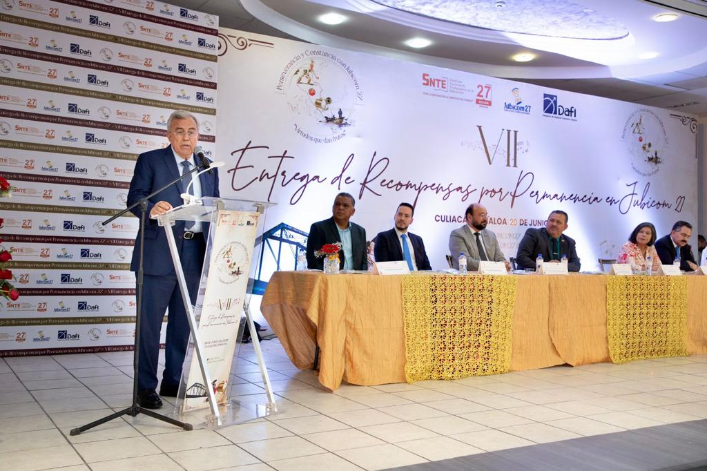En su discurso el gobernador Rubén Rocha Moya, habló de dignificar la profesión de los maestros, pues aún quedan muchas cosas por hacer por este gremio de la educación, por lo que expresó su apoyo al tema de dar de baja la reforma del ISSSTE de 2007 que trajo las cuentas individuales y también llegó a poner límites para las jubilaciones.