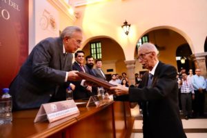 Por ello, el rector le entregó al gobernador Rocha una placa de reconocimiento y le colocó en la solapa un fistol representativo de esta institución de educación superior.