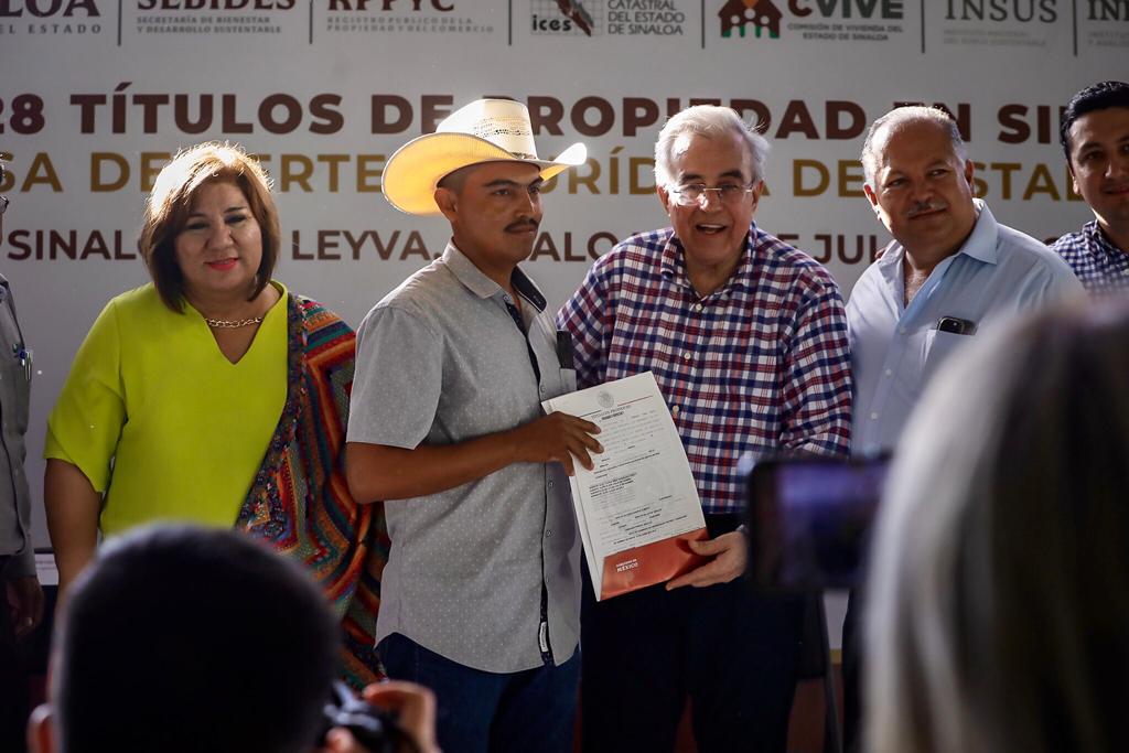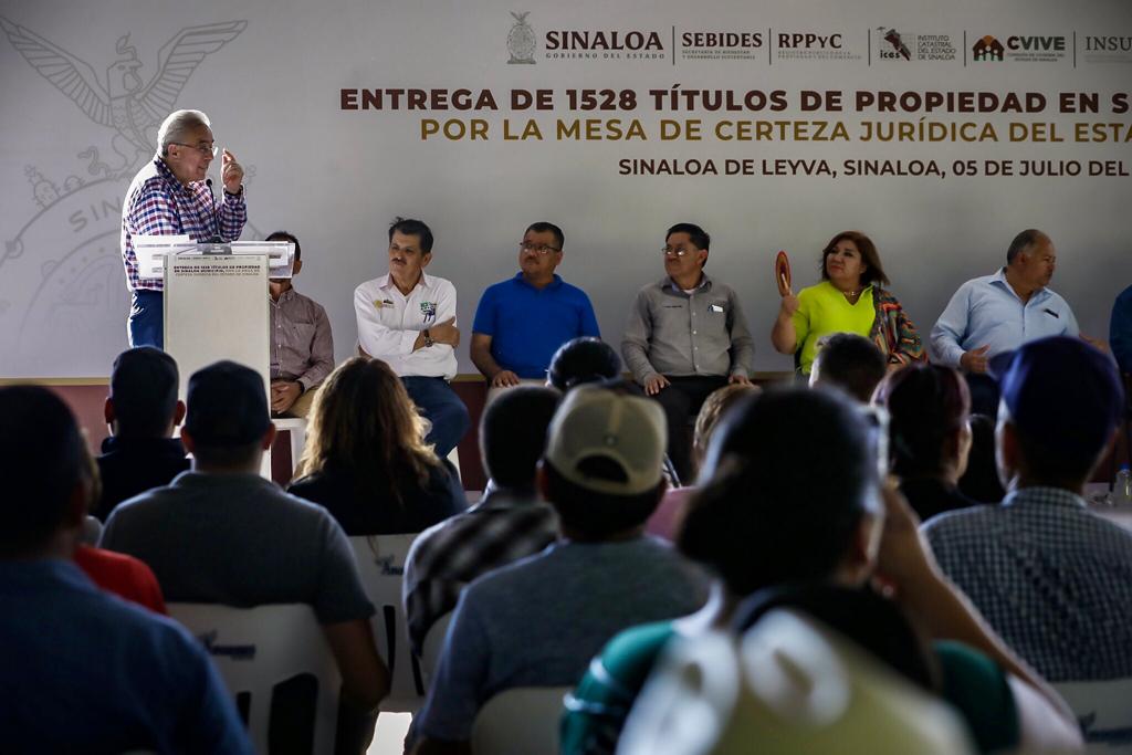 Sinaloa de Leyva, Sinaloa, a 5 de julio de 2023.- Un total de mil 528 familias de varias comunidades rurales del municipio de Sinaloa, recibieron su título de propiedad durante un evento encabezado por el gobernador Rubén Rocha Moya en la cabecera municipal de Sinaloa de Leyva, con lo cual a partir de ahora estas familias ya gozan de la certeza jurídica de la propiedad que habitan desde hace varios años.