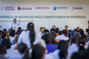 El mandatario estatal y el funcionario federal fueron recibidos en La Puntilla por el presidente municipal de Mazatlán, Luis Guillermo Benítez Torres, para hacer la entrega de esta tarjeta del Banco del Bienestar, donde se depositarán los 7 mil 200 pesos del Bienpesca federal, para mil 216 pescadoras, pescadores y empacadoras de nuevo ingreso, quienes además recibirán los 3 mil 600 pesos del complemento que otorgará el Gobierno del Estado, denominado como Bienpesca estatal, lo que totaliza los 10 mil 800 pesos de apoyo que recibirán los 30 mil beneficiarios de este programa que hay en todo el estado.