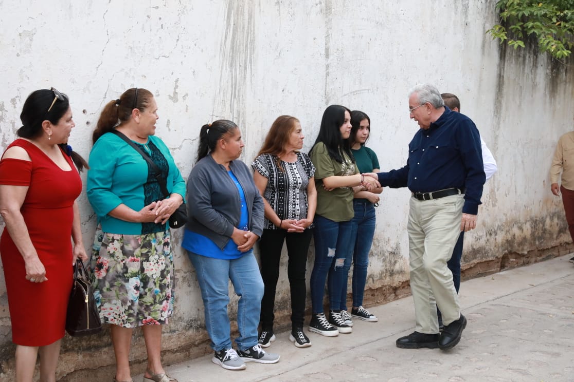 El gobernador Rocha arribó a una de las calles que fueron entregadas y antes de iniciar el evento formal, dedicó varios minutos a saludar uno por uno a los asistentes, incluso descubriendo parentescos lejanos, pues él es oriundo del poblado de Batequitas, en la zona colindante con el municipio de Mocorito.