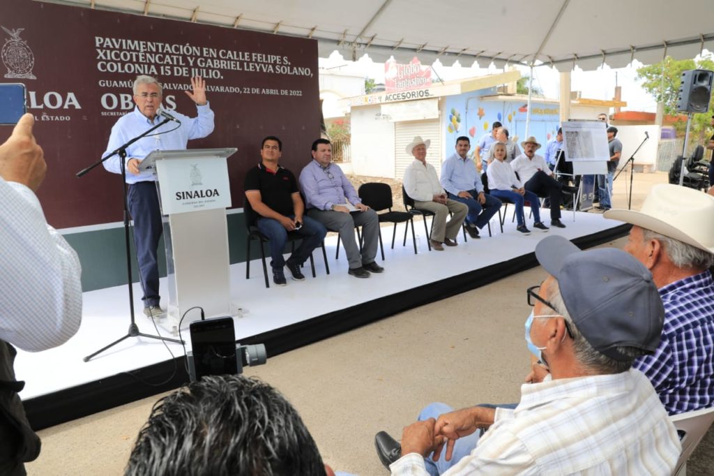 Guamúchil, Salvador Alvarado, Sinaloa, a 22 de abril de 2022.- Durante una gira de trabajo por la región del Évora, el gobernador Rubén Rocha Moya puso en marcha la pavimentación de nuevas vialidades, la primera de ellas en Alhuey, Angostura, y dos más en la ciudad de Guamúchil, que totalizan una inversión de 15 millones 165 mil pesos de recursos estatales, en favor de ambos Ayuntamientos, tanto de Angostura, como de Salvador Alvarado.
