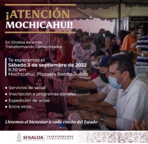 Culiacán, Sinaloa, a 2 de septiembre de 2022.- Este sábado 3 de septiembre, el gobernador Rubén Rocha Moya visitará la sindicatura de Mochicahui, en el municipio de El Fuerte, para llevar una edición más de su Programa Transformando Comunidades, que en esta ocasión ofrecerá nuevos servicios, como la realización de cirugías de cataratas, vasectomías y salpingectomías, que se canalizarán al Hospital General de Los Mochis.