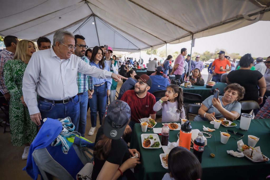 La Cofradía, Imala, Culiacán, Sinaloa, a 29 de abril de 2023.- El gobernador Rubén Rocha Moya departió con los cientos de familias que acudieron al primer día del Festival del Globo, que sábado y domingo tendrá lugar en el vaso de la presa de Sanalona, lugar conocido popularmente como Narnia, debido a su belleza natural.