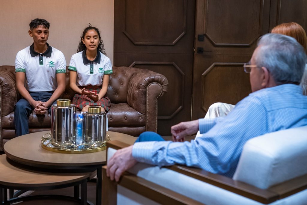 El mandatario estatal recibió en su Despacho a los jóvenes Kareidi Jazmín Olivas Pérez y Rubén Jared Aguilar Hernández, alumnos del Conalep III Mazatlán, ubicado en El Conchi, así como a sus asesores, los maestros Rosa Elena Moraila Rodríguez y Joel Jared Tirado Beltrán, quienes acompañarán a sus alumnos a esta Expo científica en Sudáfrica, hacia donde partirán este sábado desde Mazatlán.