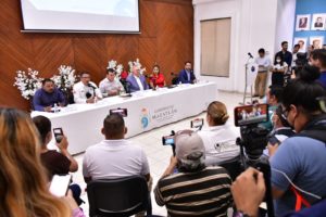 En la conferencia de prensa también estuvieron presentes el Secretario del Ayuntamiento, Edgar Augusto González Zatarain; la Oficial Mayor, Nayla Adilene Velarde Narváez; el Secretario de Desarrollo Económico, Turismo y Pesca Ricardo, Jesús Velarde Cárdenas y el Director de Servicios Públicos, David Ibarra Olmeda.