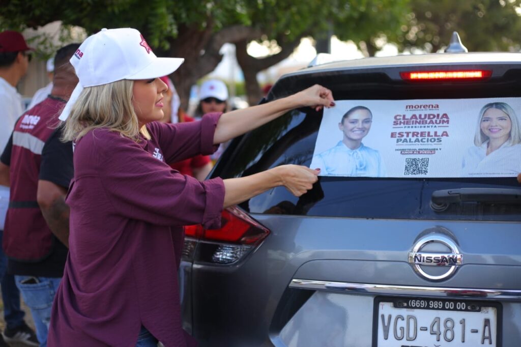 La candidata también pudo pegar varias «calcas» en vehículos donde aparece acompañada por Claudia Sheinbaum, candidata a la Presidencia de México.