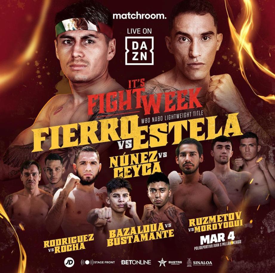 Culiacán, Sinaloa; febrero de 2023.- La capital sinaloense será sede de una cartelera de talla internacional, que tendrá como pelea estelar, la disputa del Campeonato Ligero del WBO NABO entre el mexicano Ángel Fierro y el uruguayo Eduardo Estela, a llevarse a cabo en el Polideportivo Juan S. Millán, y transmitida por DAZN en los 5 continentes.