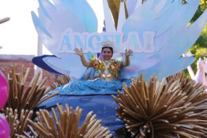 El sector infantil también tuvo su momento de magia con las aspirantes a Reina Infantil: Eileen Cruz, Noelia Vega y Elisa Gutié sonrientes y radiantes desde sus carros alegóricos decorados con tonalidades fantásticas y formas marinas.