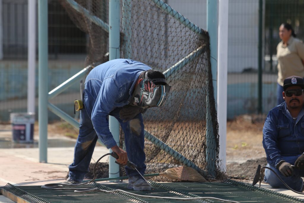 A la fecha, se colocaron las contenciones, las rejas perimetrales en el campo de fútbol de pasto sintético y cancha de usos múltiples, la nivelación del terreno y trazado del campo de sóftbol y se avanzó en la instalación eléctrica, que incluye bases de postes, ramales, colocación de postes para el alumbrado tipo LED del campo sintético y cancha usos múltiples.