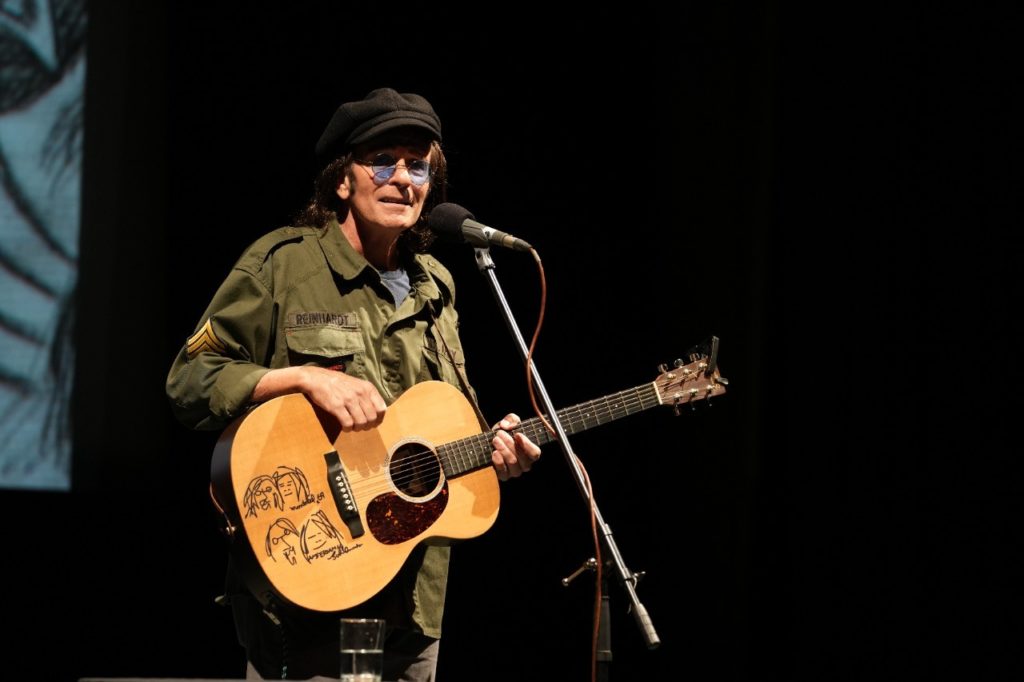 Rascando las cuerdas de su perfectamente afinada guitarra iniciaba musicalmente el monólogo llamado “El hombre de la década, una tarde con John Lennon”, el Teatro Ángela Peralta lució lleno y la mayoría de los asistentes iniciaron cantando junto a Lennon ´Come Together´.