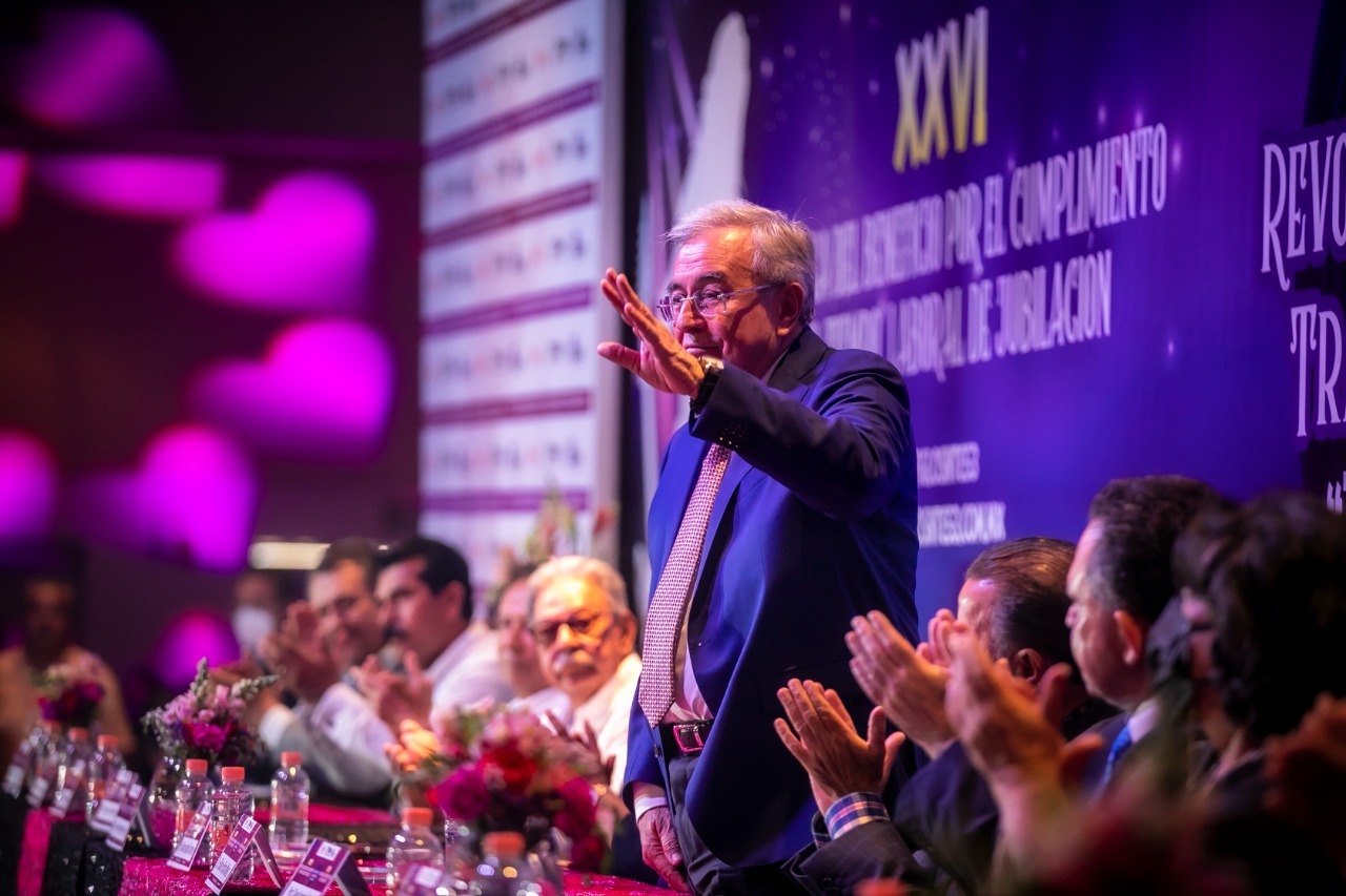Culiacán, Sinaloa a 26 de mayo de 2022.- Este jueves, el gobernador Rubén Rocha Moya asistió a la entrega número XXVI de estímulos económicos por concepto de jubilación y la entrega número XXV de beneficio por retiro, ambas de parte de FIGLOSNTE 53, en donde se vieron beneficiados 220 trabajadores con un concepto que asciende a 33.7 millones de pesos.