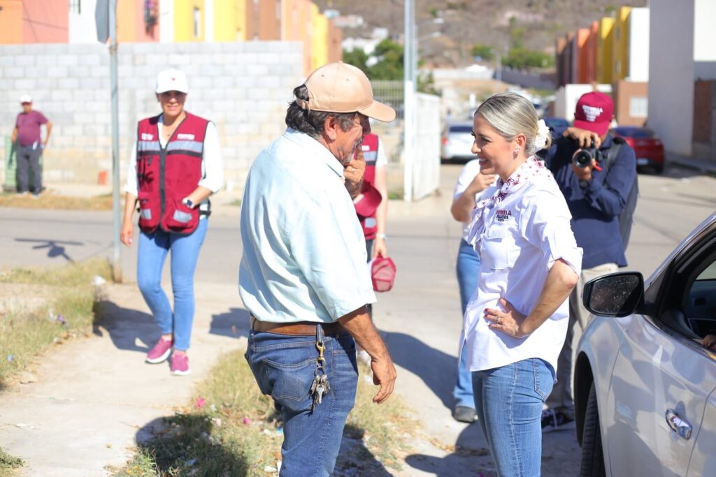 Durante su toque de puerta en una de las colonias más nuevas y urbanizadas ubicada en las faldas de los cerros del sur de Mazatlán, la candidata del pueblo fue bien recibida por las familias, por las y los niños que salieron de sus casas y se unieron a la brigada de la porra guinda de Morena.