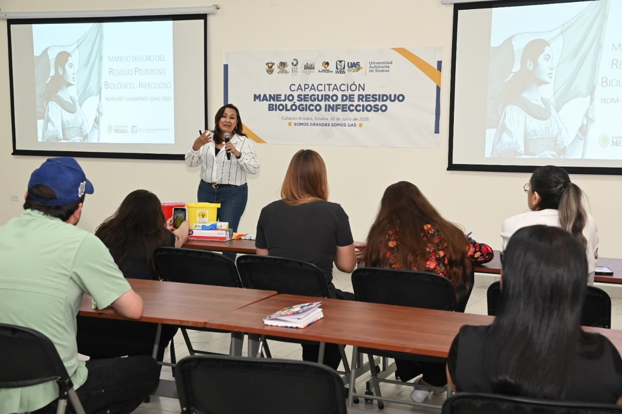 Con la meta de proteger la salud pública, el medio ambiente y el personal que labora con residuos, la Universidad Autónoma de Sinaloa (UAS), a través de la Unidad de Bienestar Universitario, la Dirección de Prestaciones Sociales y la Dirección del Sistema de Gestión de la Calidad, presentó la capacitación “Manejo Seguro de Residuo Biológicos Infecciosos” a cargo de la Coordinación de Salud en el Trabajo del Instituto Mexicano del Seguro Social (IMSS).