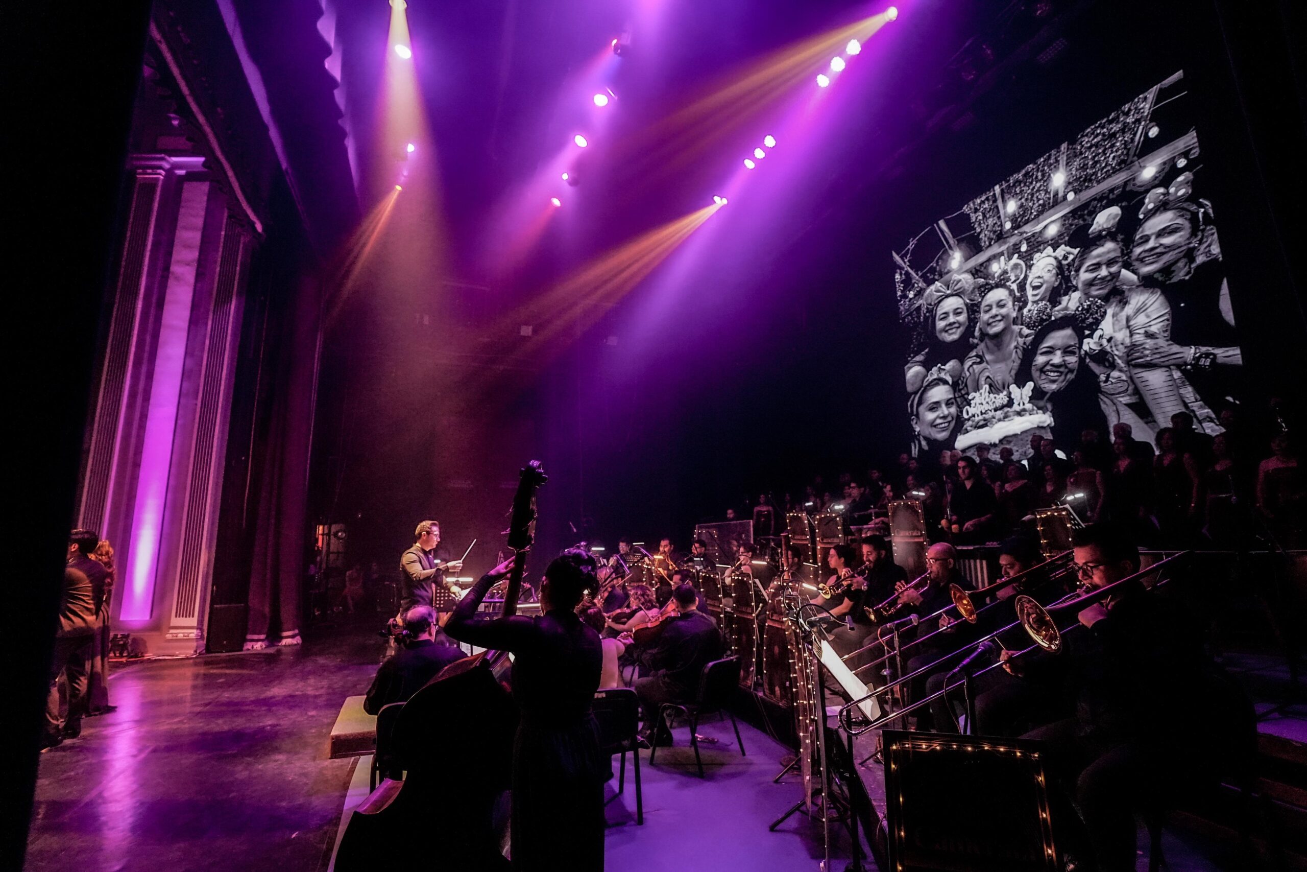Como si la luna misma hubiera querido premiar la entrega del elenco y el entusiasmo del público, el concierto concluyó con una sorpresa que envolvió al teatro en magia: una lluvia de globos dorados y anaranjados descendió desde las alturas del Ángela Peralta, mientras el elenco completo —vestido con trajes de época, lentejuelas, encajes y colores vibrantes— recibió una ovación larga y emocionada.