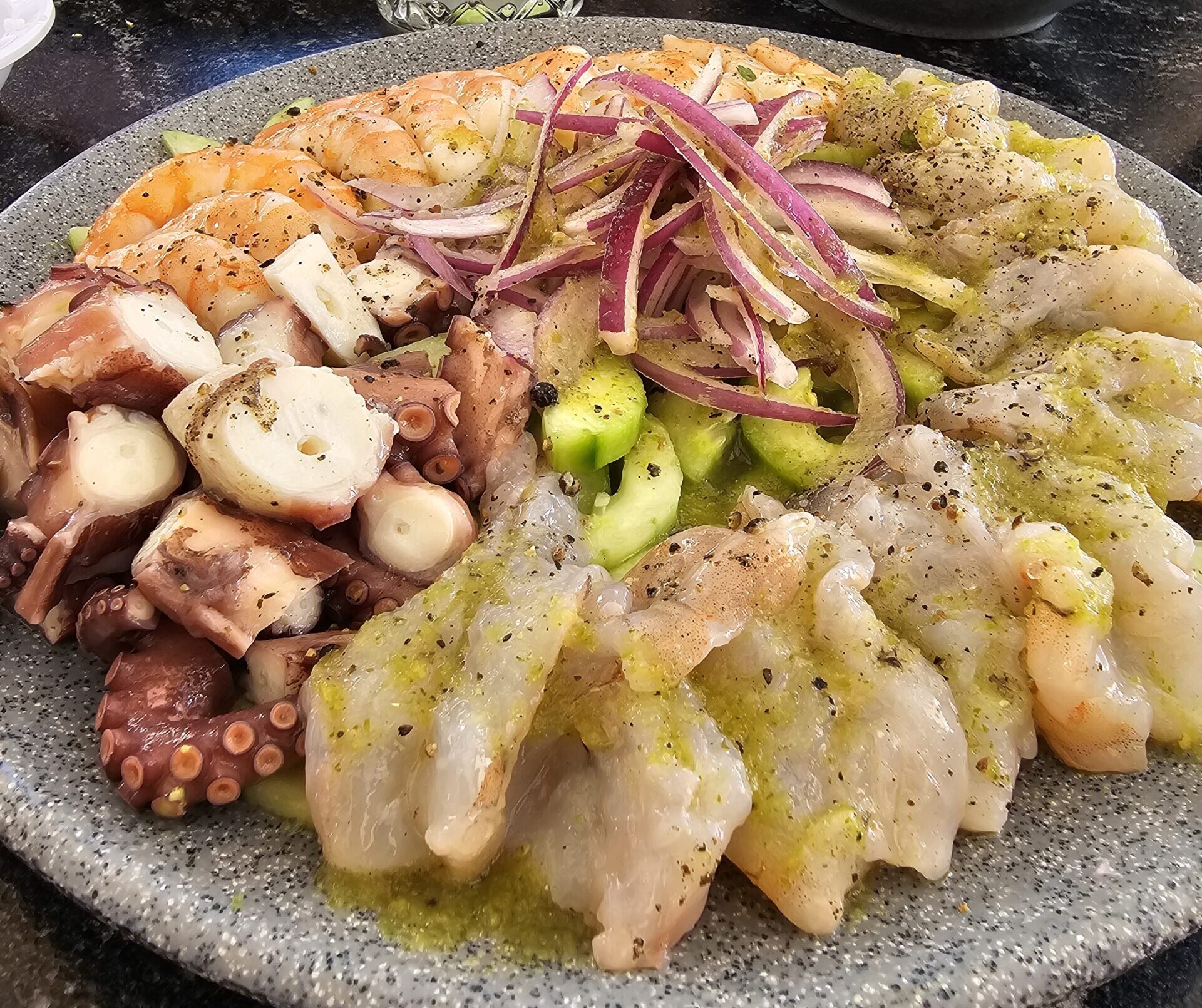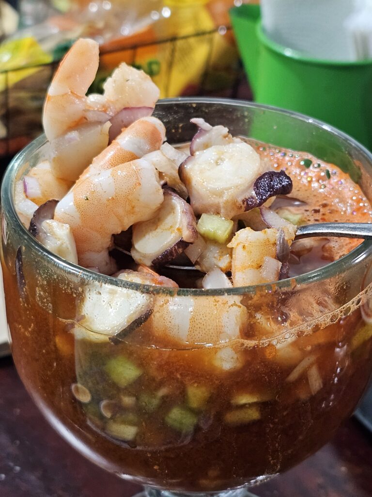 Su principal proteína es el camarón, pero este ha mejorado añadiéndole su porción de pulpo, callo de hacha, caracol y en algunos lugares atún.
