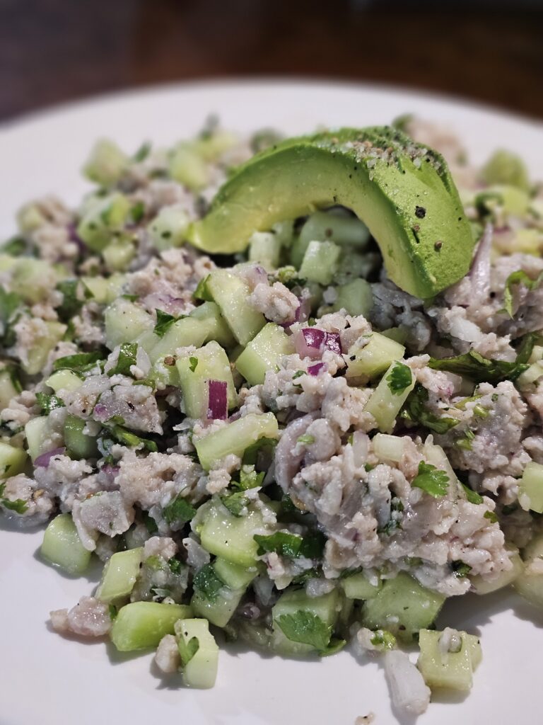 Ya como ingredientes adicionales se le agrega su pepino picado y cebolla morada, así como un toque de salsa al gusto y de mejor preferencia. No olviden sus tostadas o galletas saladas.