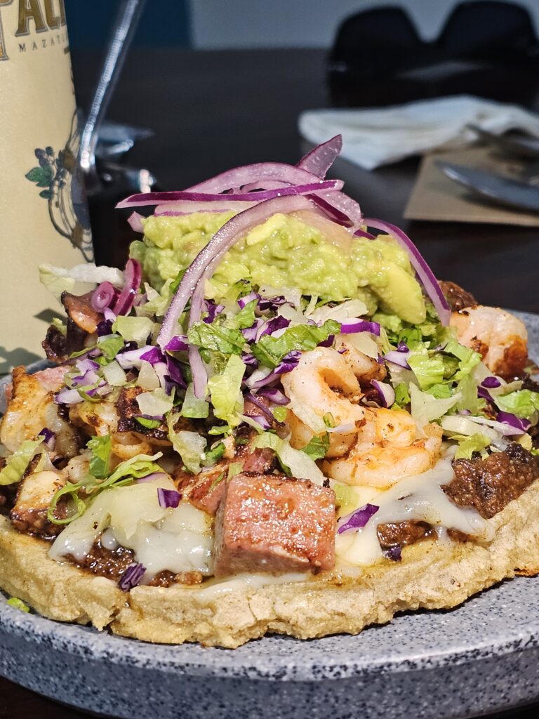 Esta receta consiste en la típica tortilla hecha de maíz a la que se le agrega los “asientos de puerco”; posteriormente se le encima el queso chihuahua derretido y luego el camarón y pulpo cocido. También se le puede agregar medallón de atún o jaiba, lo que más te guste. Lo que diferencia a este platillo son las salsas que se le agregan, sin olvidar el delicioso guacamole.