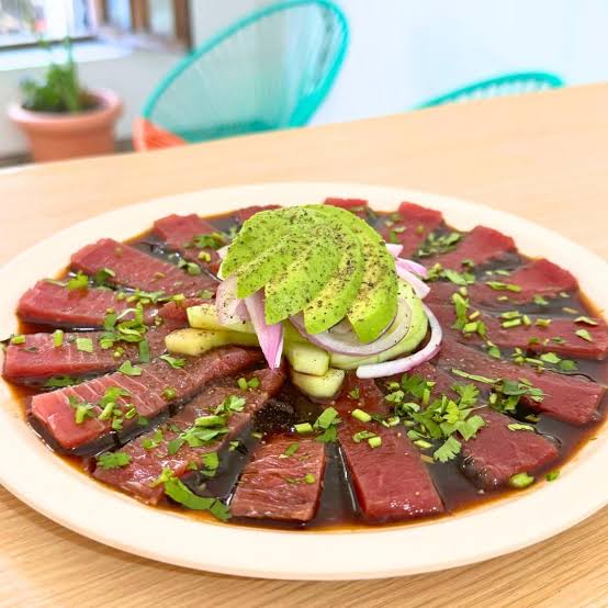 Aunque este platillo es de origen japonés, Mazatlán lo ha adoptado por el sabor único que se le ha dado al atún. Al igual que le estilo aguachile, el sashimi de atún es combinado con una salsa negra que le da un sabor inigualable a la proteína, añadiéndole el pepino en rodajas, cebolla morada y aguacate también en rodajas.